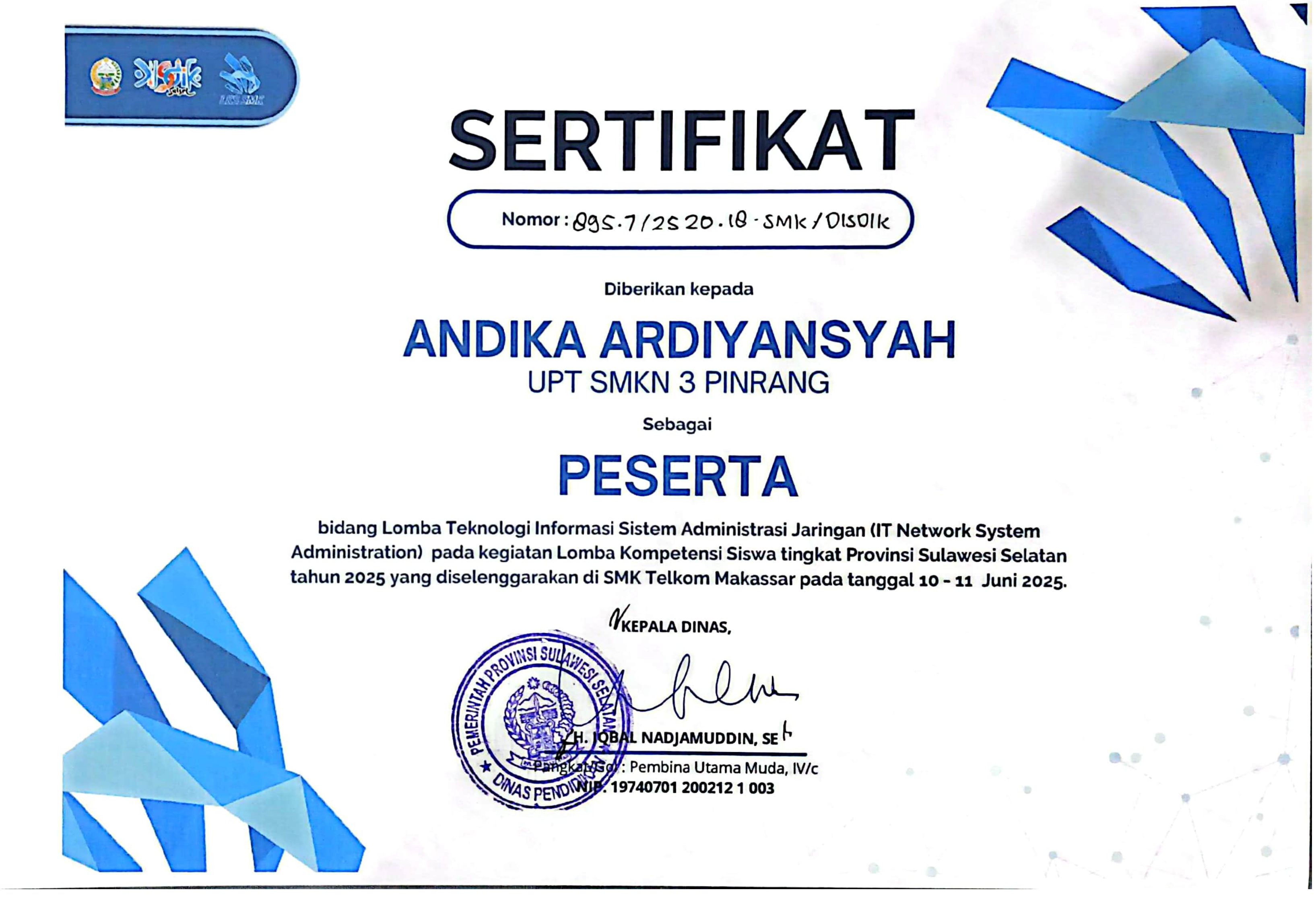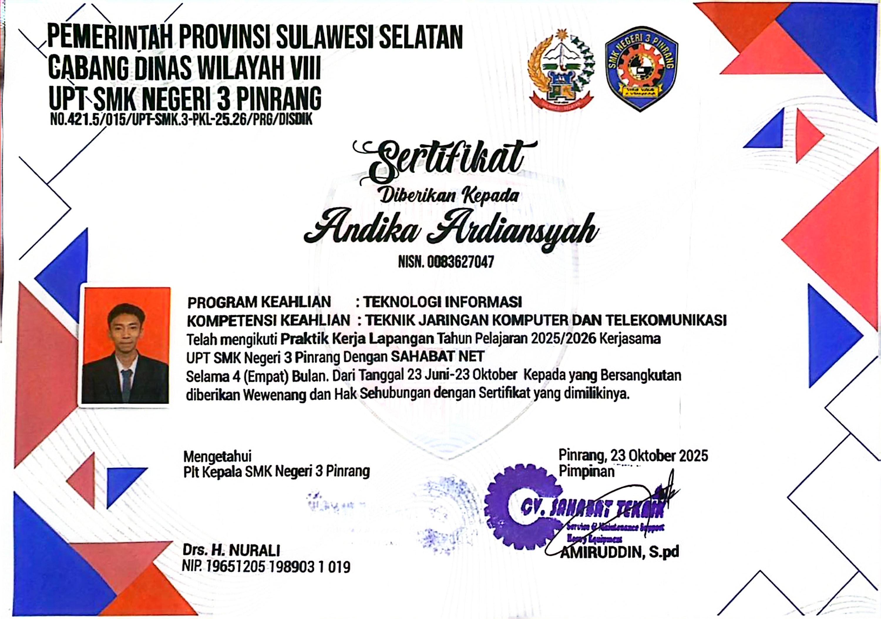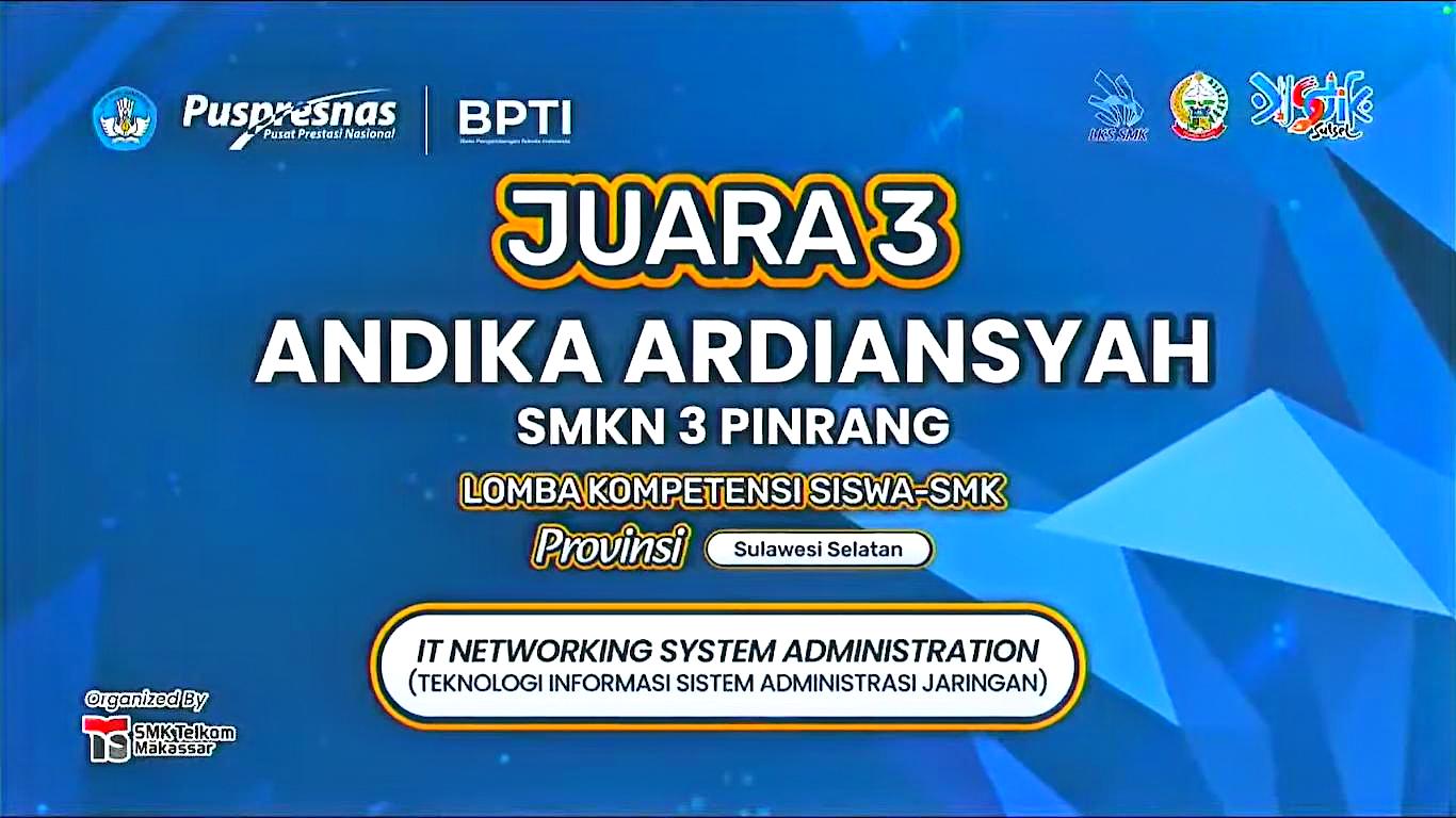 Deskripsi: Saya adalah seorang siswa dari SMKN 3 Pinrang yang memiliki kemampuan di dunia teknologi informasi, khususnya dalam Administrasi Sistem Jaringan. Saya memiliki kemampuan dalam mengonfigurasi infrastruktur server, manajemen jaringan, dan pemecahan masalah sistem yang kompleks, dan Berpengalaman dalam mengelola layanan server (Debian/Ubuntu/Cisco/Mikrotik) dan memastikan konektivitas jaringan tetap optimal